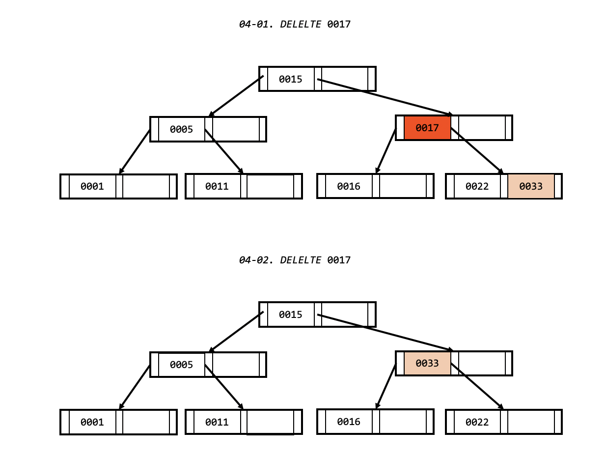 - 리프 노드가 아닌 중간 노드에서 값 삭제.