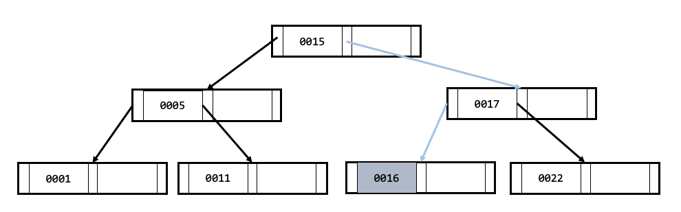 - 다음 노드에 0016 값이 존재하는지 찾아봅니다. 존재하지 않으므로 0016 값의 범위 위치를 찾습니다. (0016 < 0017)