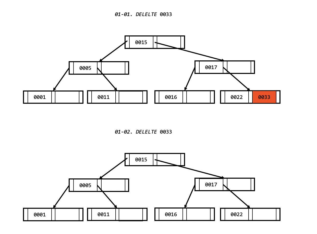 - 부모 노드도 최소 개수 조건을 만족하지 않는다면, 1번 과정을 리프 노드 대신 부모 노드로 치환하여 수행합니다.