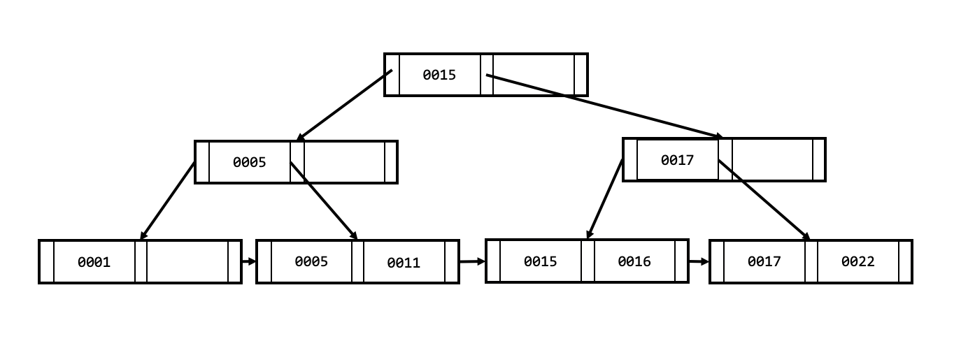 다음의 예시를 보면, 리프 노드들은 모든 값들을 포함하고 있고 연결리스트 형태를 구성하고 있습니다.
