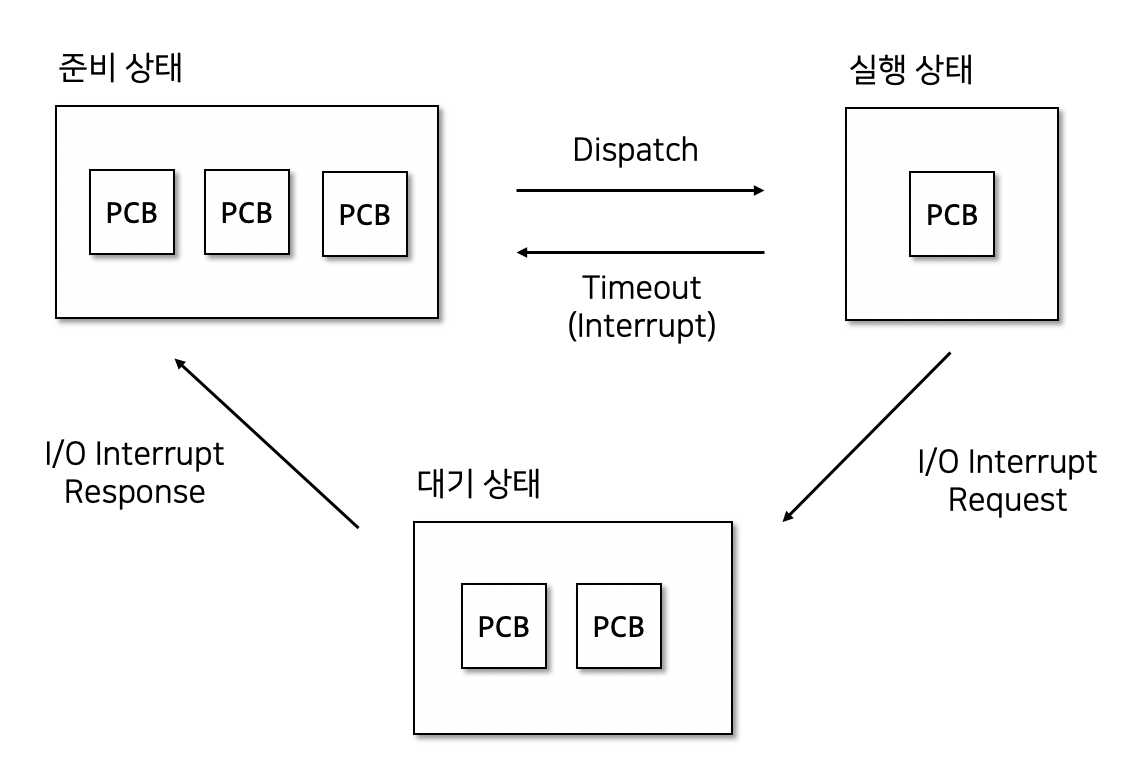 프로세스 상태에 따라 정해진 절차대로 수행하는 것을 프로세스 스케줄링 이라 부르며 프로세스 스케줄러 라는 프로그램이 수행합니다.
